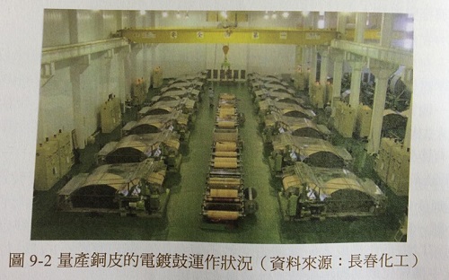 使用RA銅皮作為柔性線路板材料,已經(jīng)不是必然的柔性線路板金屬材料選擇邏輯,因?yàn)橐呀?jīng)有ED銅皮實(shí)際使用在所謂的無(wú)膠材料的應(yīng)用案例。電鍍可以簡(jiǎn)單的制作出薄銅皮,并具有優(yōu)異撓曲性與更好耐受操作損傷能力的產(chǎn)品,且其成本也比較低。圖9-2所示,為大量生產(chǎn)電鍍銅皮的工廠設(shè)施。