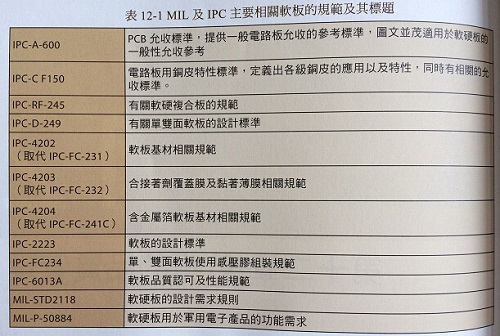 業(yè)者以遵循MIL及IPC規(guī)范為主,輔以其它的規(guī)范與準(zhǔn)則來當(dāng)作軟板品質(zhì)管理的依據(jù)。表12-1表示,為一般業(yè)者常用的規(guī)范可做為參考。