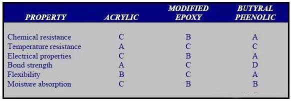 在柔性板設(shè)計(jì)時(shí),選擇合適的膠來(lái)粘接導(dǎo)體和介質(zhì)也是非常重要的。它必須保證FPC 在加工時(shí)不脫膠或不過多地溢膠。柔性板常用的膠有丙烯酸(acrylic),改良環(huán)氧樹脂(modified epoxy), 酚丁縮醛(Phenolic Butyrals),增強(qiáng)膠,壓敏膠等等。下表列舉了幾種膠的特性。