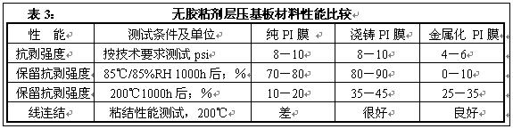 但是它有其局限性,在生產(chǎn)高密度柔性電路板時(shí),層壓覆蓋膜常常面臨著為適應(yīng)器件的安裝需開窗口,形窗口的尺寸精度靠機(jī)械加卻受到很大的限制,無法滿足0.50毫米以下的小節(jié)距的技術(shù)要求。第二個(gè)方面就是覆蓋層膠粘劑的流動(dòng)和開窗口對(duì)位的精度。既是進(jìn)行加工卻成本很高。有的消費(fèi)類的電子產(chǎn)品為了節(jié)省加工成本于是采用涂覆阻焊油墨來取代覆蓋膜,雖然也能起到保導(dǎo)線的作用,然而它不具有良好的機(jī)械特性,更不適用動(dòng)態(tài)撓性方面的應(yīng)用,因此它的應(yīng)用受到很大的限制。為此,為解決它于是出現(xiàn)液態(tài)感光型覆蓋層,不但能順利地解決加工精度問題,而成本降較低,并簡(jiǎn)化了生產(chǎn)工藝。只要采用普通型標(biāo)準(zhǔn)的UV曝光機(jī)、水溶性顯影液顯影、然后加熱進(jìn)行后固化的工藝,省去了常規(guī)采用層壓工序。目前已經(jīng)研制與開發(fā)很多種新材料與新技術(shù),有的已應(yīng)用在批量生產(chǎn)上發(fā)揮了重要的作用。見表3: