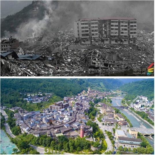 上圖:遭遇地震“洗劫”的汶川 下圖:重建后的汶川新貌