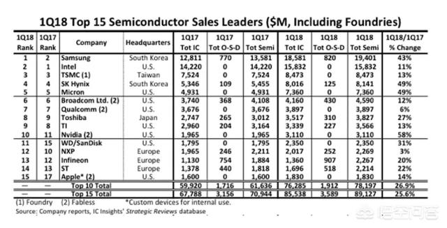 三星的產能已經超越英特爾,位居第一了,可以看出來,芯片產業(yè)的老大還是美國,韓國、日本和歐洲瓜分了剩下的部分。