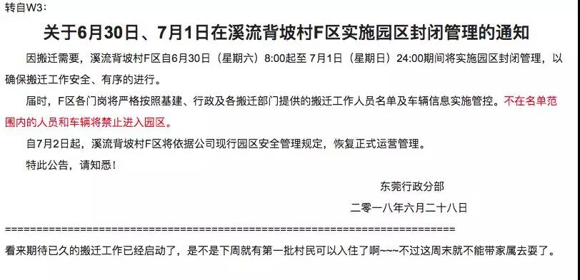 而從華為官方論壇“心聲社區(qū)”的最新發(fā)帖顯示,華為公司已于7月1日正式搬遷,40輛8噸貨車(chē),共60車(chē)次,搬遷車(chē)輛將往返深圳和東莞松山湖。7月2日,將有2700人從深圳到東莞松山湖溪流背坡村上班,約有1500輛車(chē)(其中大巴70輛)。 “心聲社區(qū)”標(biāo)題為《關(guān)于6月30日、7月1日在溪流背坡村F區(qū)實(shí)施園區(qū)封閉管理的通知》的帖子截圖。