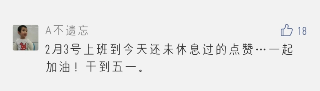 小編甚至還看到有家人留言說:從2月3號(hào)(小范圍復(fù)工)開始,一直工作到現(xiàn)在都還沒有休息過,甚至還鼓勵(lì)大家一起加油干,干到五一!