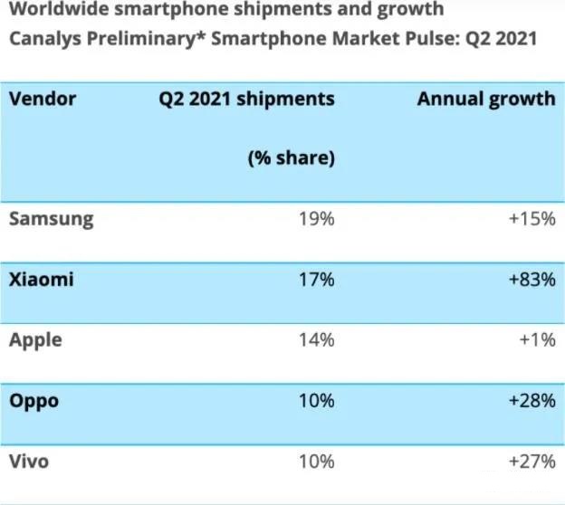 其中,三星是第二季度中出貨排名第一的智能手機(jī)廠商,占總出貨量的19%。小米則在二季度智能手機(jī)出貨同比大漲83%,成功超越蘋(píng)果,首次成為全球第二大智能手機(jī)廠商,市場(chǎng)占有率達(dá)到了17%。而蘋(píng)果公司則以14%的份額位居第三,vivo和OPPO的出貨均保持了27%-28%左右的增長(zhǎng)勢(shì)頭,分別排名第四和第五,市場(chǎng)份額均為10%。