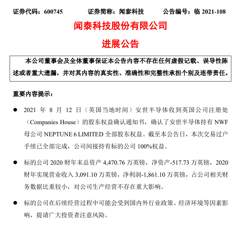 根據(jù)當(dāng)時的公告,本次交易完成后,安世半導(dǎo)體將持有NEPTUNE 100%股權(quán),并通過NEPTUNE持有NWF 100%權(quán)益。標(biāo)的公司2020財年末總資產(chǎn)4,470.76萬英鎊,凈資產(chǎn)-517.73 萬英鎊,2020財年實現(xiàn)營業(yè)收入3,091.10萬英鎊,凈利潤-1,861.10萬英鎊。