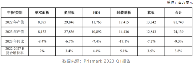 FPC廠了解到,受智能手機、PC等傳統(tǒng)消費電子需求疲軟等因素影響,2022年開始PCB整體需求轉弱。根據Prismark 2023年第一季度報告,2023年全球PCB產業(yè)以美元計價的產值將同比降低9.3%,較去年第四季度的預測下滑5.2個百分點。