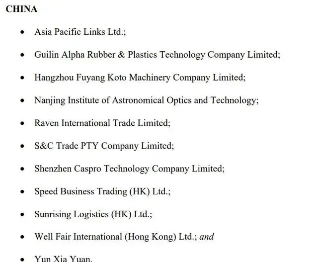 軟板廠了解,28 個實體中,10 個實體和1 名自然人來自中國、俄羅斯和巴基斯坦分別有5 個、芬蘭3 個、阿曼2 個、德國和阿聯(lián)酋各1 個。具體涉及中企名單包括中國科學(xué)院國家天文臺南京天文光學(xué)技術(shù)研究所、杭州富陽科拓機械有限公司和桂林阿爾法橡塑科技有限公司等。