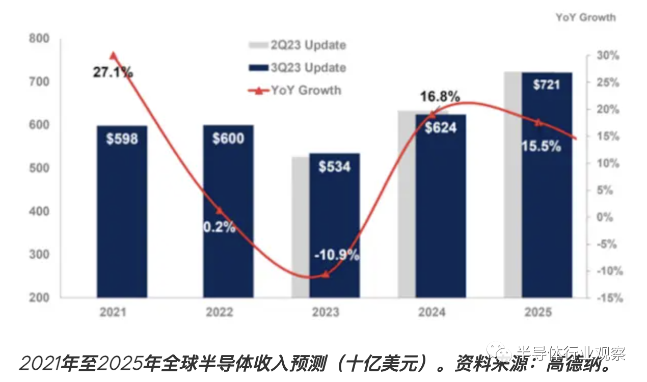 但根據(jù)Gartmer目前的預(yù)計(jì),在 16.8% 的強(qiáng)勁增長(zhǎng)之后,2025 年全球芯片銷售額將增長(zhǎng) 15.5%,達(dá)到 7,210 億美元。值得一提的是,Gartner 還表示,全球芯片市場(chǎng)到 2023 年將下降 11%。