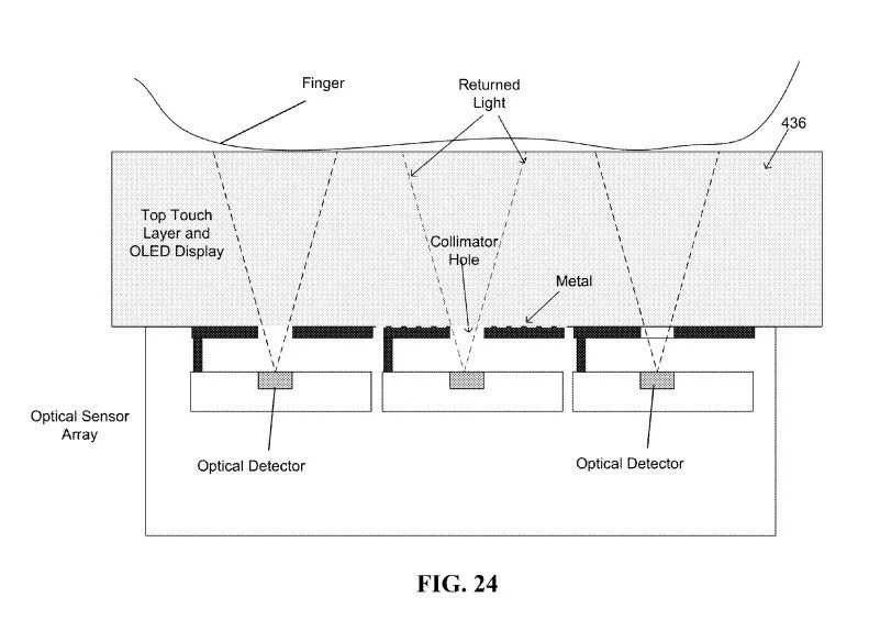 FIG.24從微觀角度則說明了光線是如何穿透OLED屏幕的,最上面的就是手指;偏上這層灰色區(qū)域就是手機的屏幕部分。透過屏幕的小孔,匯頂稱之為“準(zhǔn)直孔(Collimator Hole)”,手指反射回的光線光學(xué)傳感器搜集、處理。