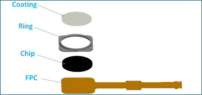 如下圖,為一款典型的按壓式指紋識(shí)別模組及分解圖,一個(gè)完整的指紋識(shí)別模組主要由:Cover、Ring,指紋識(shí)別Chip和承載ChiP的FPC組成。