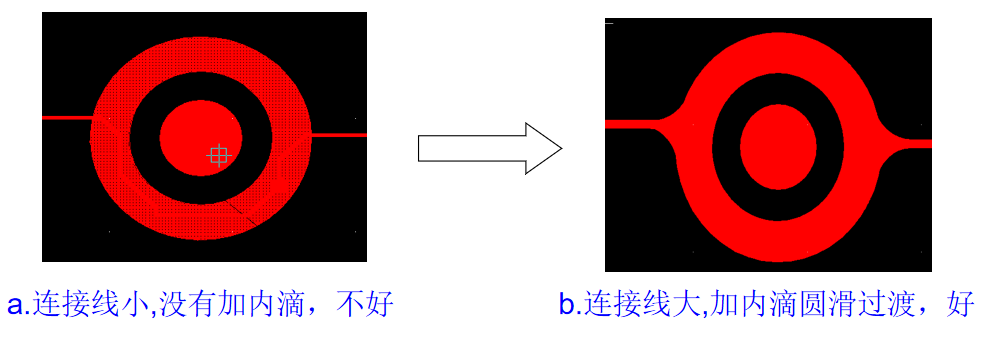 按鍵的連接線線寬最小0.2mm,在與按鍵的交接處要加圓滑內滴過渡,所以焊盤都要加內滴。
