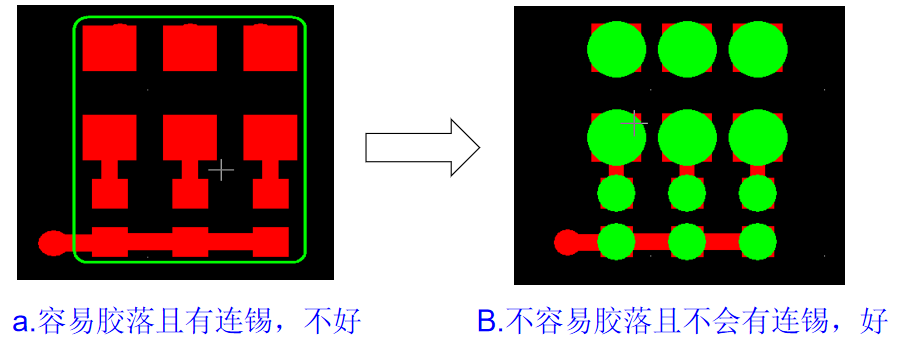焊盤與焊盤有線的,盡量不要開通窗(特殊情況除外),以免造成連錫,影響SMT質量(如下圖綠色為包封開窗)。
