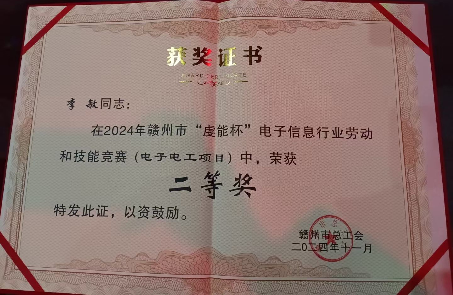 維修部李敏以優(yōu)越成績(jī)獲得2024年贛州市“虔能杯”電子電工技能大賽二等獎(jiǎng);贛州市總工會(huì)“個(gè)人勞動(dòng)模范稱號(hào)”表彰。