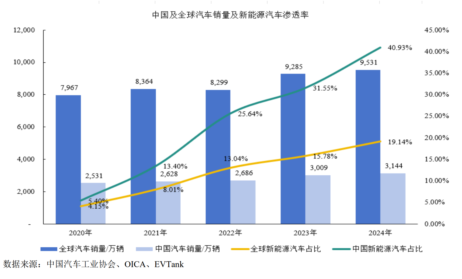2024年度,全球及中國(guó)汽車(chē)銷(xiāo)量分別為9,531萬(wàn)輛和3,144萬(wàn)輛,同比分別增長(zhǎng)2.6%、4.5%,全球及中國(guó)新能源汽車(chē)產(chǎn)銷(xiāo)分別為1,824萬(wàn)輛、1,287萬(wàn)輛,同比分別增長(zhǎng)24.5%、35.5%,繼續(xù)保持快速增長(zhǎng),新能源汽車(chē)銷(xiāo)量占汽車(chē)總銷(xiāo)量的比例分別達(dá)到19.1%、40.9%,中國(guó)成為引領(lǐng)全球汽車(chē)產(chǎn)業(yè)轉(zhuǎn)型的重要力量。