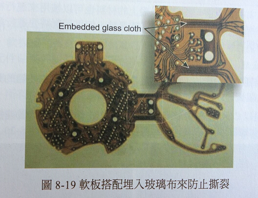 可以在制程中用玻璃布壓合在轉(zhuǎn)角上,這個方法經(jīng)過美國軍方產(chǎn)品驗證相當(dāng)穩(wěn)定有效。不過它相當(dāng)昂貴,因為相當(dāng)費工且需要小心操作,還會影響到部分FPC柔軟性,目前還在找替代方案(參考圖8-19)。