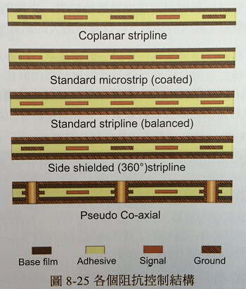 阻抗控制電子訊號傳輸電纜的應用,是FPC最適合發(fā)揮能力的應用之一。因為高速、高性能的電子產品快速增加,使用阻抗控制互連技術的產品可以期待會成長。后續(xù)內容是一些可以取得的FPC結構類型,圖8-25所示為各個類型的范例。