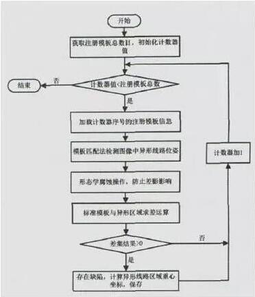 中國計量學院針對傳統(tǒng)模板匹配算法的速度慢、準確率低等問題,提出將FPC板線路缺陷分為全局缺陷和局部缺陷兩類,采用八連通域面積法結(jié)合直方圖匹配方式捕獲圖像全局缺陷,在此基礎(chǔ)上利用投影匹配及相關(guān)系數(shù)法識別圖像中的局部缺陷。該方法較傳統(tǒng)檢測算法更快,更為準確,但相關(guān)的缺陷類別的分類還不夠細致。