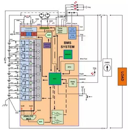 電池管理系統(tǒng)(BMS)主要分為兩部分,第一部分是前端模擬測(cè)量保護(hù)電路(AFE),包括電池電壓轉(zhuǎn)換與量測(cè)電路、電池平衡驅(qū)動(dòng)電路、開(kāi)關(guān)驅(qū)動(dòng)電路、電流量測(cè)、通訊電路;第二部分是后端數(shù)據(jù)處理模塊,就是依據(jù)電壓、電流、溫度等前端計(jì)算,并將必要的信息通過(guò)通信接口回傳給系統(tǒng)做出控制。