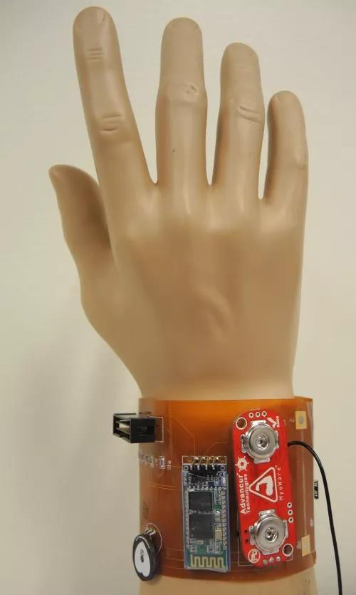 Auburn展示一款安全腕帶,可用于監(jiān)測(cè)在危險(xiǎn)情況下工作的人員。目前的設(shè)計(jì)采用聚酰亞胺基板,但該團(tuán)隊(duì)也正研究如何在其它塑料基板上使用增層印刷以利電路布局。
