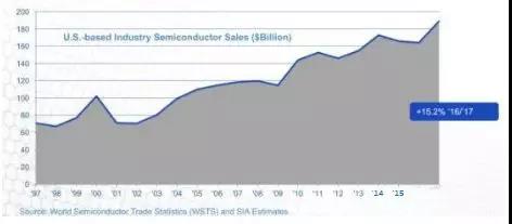 據(jù)統(tǒng)計(jì),總部位于美國的半導(dǎo)體公司的銷售額在1997年的時(shí)候僅為709億美元,到了2017年,這個(gè)數(shù)字已經(jīng)飆升到18890億美元,年平均符合增長率達(dá)到5.02%。我們從總部位于美國的半導(dǎo)體公司的銷售額變化可以看到半導(dǎo)體產(chǎn)業(yè)的周期性波動(dòng)特征。