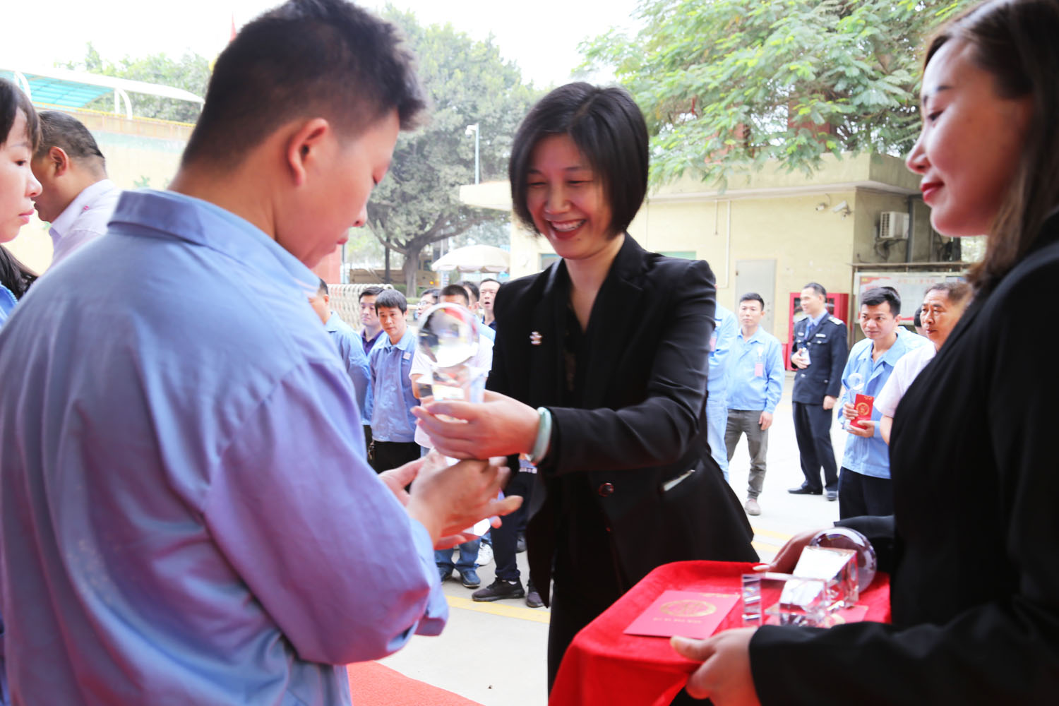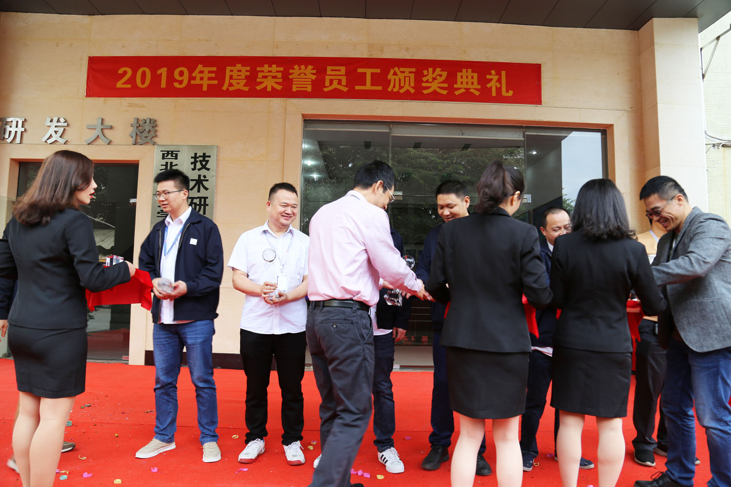激情昂揚(yáng)的音樂(lè)聲響起,各領(lǐng)導(dǎo)一起為70名職工頒發(fā)榮譽(yù)員工獎(jiǎng)杯和紅包,大家臉上都洋溢著幸福的笑容。
