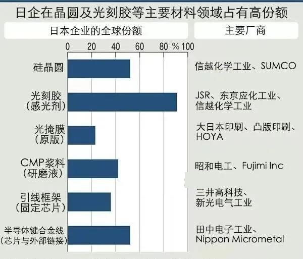 來到集成電路生產(chǎn)不可或缺的光刻膠領(lǐng)域,日本企業(yè)所占的份額也達(dá)到9成。JSR及信越化學(xué)等企業(yè)占有優(yōu)勢。昭和電工等正在生產(chǎn)半導(dǎo)體表面研磨用的CMP研磨液,日本企業(yè)所占的份額也超過4成。