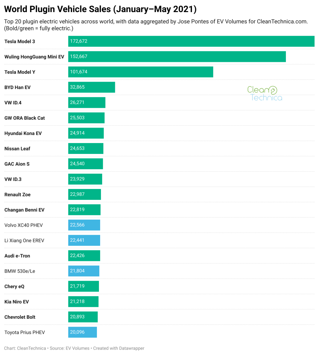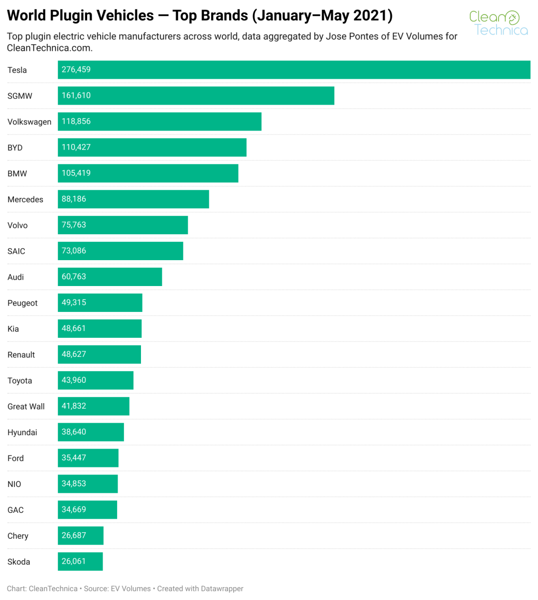 近日,據(jù)汽車FPC廠了解,國外新能源汽車媒體CleanTechnica公布了2021年1-5月全球新能源汽車銷量數(shù)據(jù)。需要注意的是,這份數(shù)據(jù)統(tǒng)計的是電動化產(chǎn)品,即包括純電動車以及插電式混合動力。從數(shù)據(jù)來看,在今年前五月有五個品牌銷量超過10萬輛,銷量前三品牌分別是特斯拉、上汽通用五菱和大眾,比亞迪完成對寶馬的趕超,躋身排名第四。