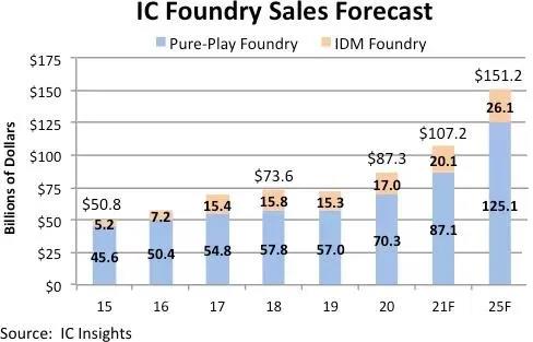 預(yù)計(jì)今年的代工總銷售額將首次超過1000億美元大關(guān),并繼續(xù)以強(qiáng)勁的11.6%的同比速度增長,到2025年總代工銷售額預(yù)計(jì)將達(dá)到1512億美元。