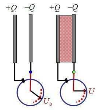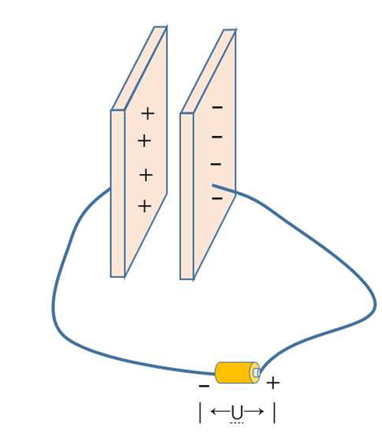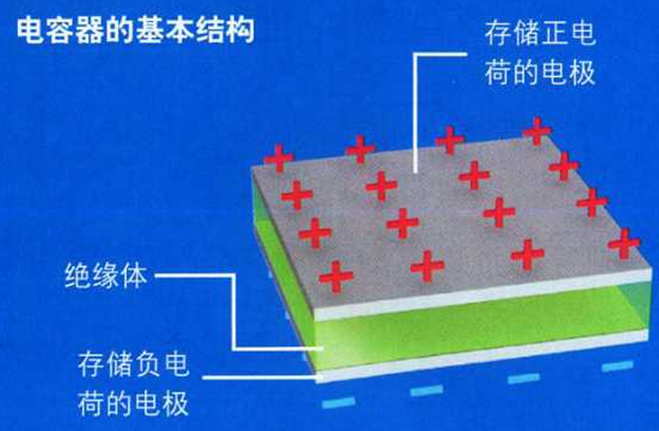 電容是由兩個(gè)相互靠近的導(dǎo)體構(gòu)成的,這兩個(gè)導(dǎo)體一般是由兩片面積一樣大的導(dǎo)體面對(duì)面平行放置,兩片導(dǎo)體之間的間隔較小。我們以最簡(jiǎn)單的一個(gè)電容器為例,下面是一個(gè)由兩片金屬版面對(duì)面放置構(gòu)成的一個(gè)電容器,中間隔絕著空氣,那么它是如何存儲(chǔ)電量的呢?