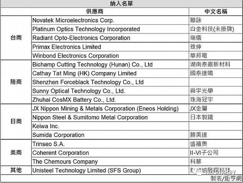 新增進(jìn)入蘋果供應(yīng)鏈的10家中國(guó)廠商分別為:湖南泰嘉新材料、國(guó)泰達(dá)鳴、舜宇光學(xué)、珠海冠宇及深圳墨力科技(Shenzhen Forceblack Technology),以及來(lái)自中國(guó)臺(tái)灣的聯(lián)詠、華邦電子、瑞儀、致伸及白金科技。值得一提的是,聯(lián)詠、華邦電、白金科技是首度進(jìn)入蘋鏈,瑞儀與致伸則是重回蘋果供應(yīng)鏈。