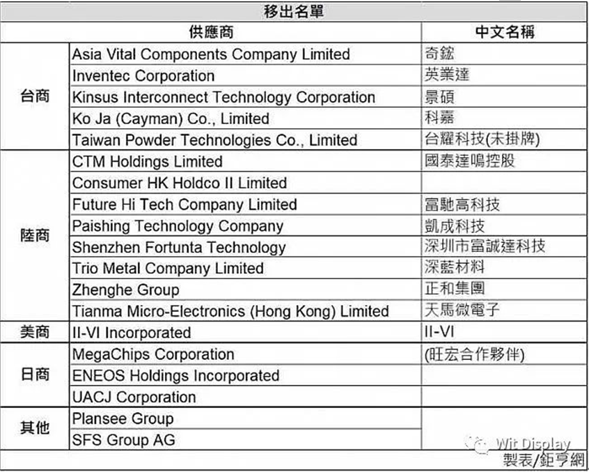 手機(jī)無(wú)線充軟板廠深深了解到,被剔除出蘋果供應(yīng)鏈的8家中國(guó)廠商分別為:CTM Holdings Limited、Consumer HK Holdco II Limited、富馳高科技、凱成科技、深圳市富誠(chéng)達(dá)科技、深藍(lán)材料、正和集團(tuán)、天馬微電子,以及中國(guó)臺(tái)灣的奇鋐、英業(yè)達(dá)、景碩、科嘉及臺(tái)耀科技。值得注意的是,去年科嘉與臺(tái)耀科技才剛加入蘋鏈,今年就被移出。