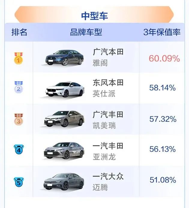 其中,緊湊型車上榜車型均為日系車,除思域外,卡羅拉、騏達(dá)、雷凌以及馬自達(dá)3昂克賽拉均名列榜單,并且保值率差距非常相近,這也意味著同級(jí)競(jìng)爭(zhēng)十分激烈。中型車保值率則被日系和德系車瓜分,但榜單前4名車型也均為日系車,分別為雅閣、英仕派、凱美瑞和亞洲龍,其中,凱美瑞保值率由2022年的64.04%下滑至今年上半年的57.32%,而亞洲龍保值率則出現(xiàn)了較大幅度的增長(zhǎng),由2022年的50.69%上升到今年上半年的56.13%。另外,榜單中,邁騰以51.08%的保值率排名第5名,是榜單中唯一一款德系車。