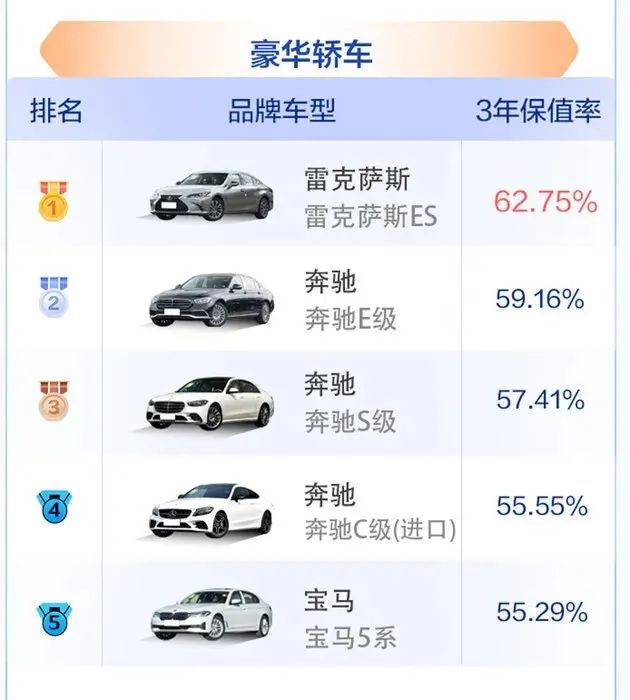至于豪華轎車市場(chǎng)方面,雷克薩斯ES以62.75%的保值率領(lǐng)先其它車型,但相比2022年的68.08%下降明顯,報(bào)告顯示,下滑的原因與終端銷售價(jià)格松動(dòng)有關(guān)。此外,榜單中上榜的3款奔馳車型和1款寶馬車型三年保值率均已跌破60%。