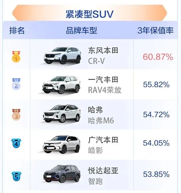 緊湊級(jí)SUV市場(chǎng)中,位居榜首的是東風(fēng)本田CR-V,3年保值率為60.87%,排名第2至第5名的分別是一汽豐田RAV4榮放、哈弗M6、廣汽本田皓影、悅達(dá)起亞智跑,3年保值率均在55%-53%區(qū)間。其中,哈弗M6是榜單中的“黑馬”,其保值率相比2022年上漲超10%。中型SUV市場(chǎng)中保值率整體水平出現(xiàn)了一定程度的下降,但廣汽豐田漢蘭達(dá)保值率依舊較為穩(wěn)定,報(bào)告稱,雖然廣汽本田冠道和東風(fēng)本田UR-V排名沒(méi)有發(fā)生變動(dòng),但受新車優(yōu)惠幅度增大影響,兩者已經(jīng)與漢蘭達(dá)拉開差距。