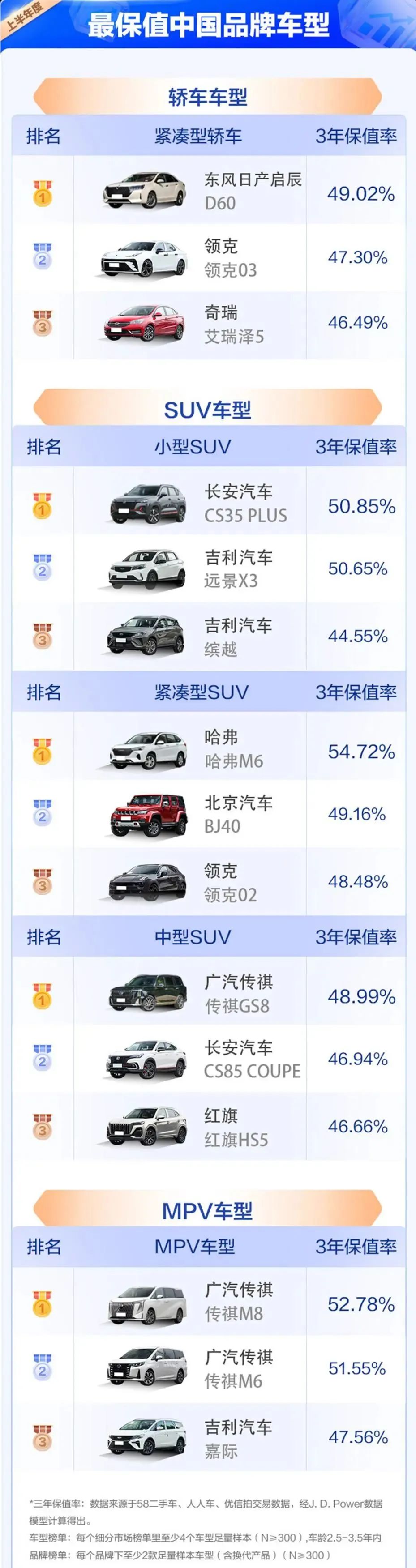 軟板廠看到了,整個(gè)榜單中,報(bào)告還詳細(xì)列舉了中國(guó)品牌細(xì)分車型TOP3,其中東風(fēng)日產(chǎn)啟辰D60以49.02%的保值率領(lǐng)先其它車型,成為中國(guó)品牌轎車最保值車型。而在SUV車型中,哈弗M6、傳祺GS8、長(zhǎng)安CS35 PLUS分別位列緊湊型SUV、中型SUV和小型SUV榜單中榜首位置。