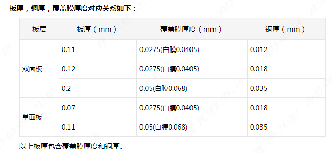首先看板厚,正?;腜I厚度和銅厚都是固定的,兩者相加就是固定的材料厚度,比如PI基材厚度一般是25um,選1oz銅就是35um,雙面板基材厚度就是35+25+35=95um,注意這僅僅是基材的厚度,成品厚度再加上覆蓋膜的厚度就可以了,覆蓋膜厚度見下表,所以標(biāo)示成品厚度為0.13,0.15mm的板厚基本上都是有膠基材了。