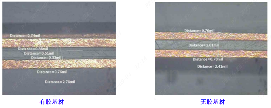 再看彎折效果,有膠基材彎折比較僵硬,無(wú)膠基材彎折更柔軟:
