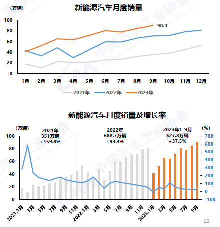 9月,新能源汽車?yán)^續(xù)保持較快增長。當(dāng)月產(chǎn)銷分別達(dá)到87.9萬輛和90.4萬輛,環(huán)比分別增長4.3%和6.8%,同比分別增長16.1%和27.7%,市場占有率達(dá)到31.6%。在新能源汽車主要品種中,與上月相比,純電動(dòng)汽車產(chǎn)量微降、銷量小幅增長,插電式混合動(dòng)力汽車產(chǎn)銷兩位數(shù)增長,燃料電池汽車產(chǎn)量較快增長、銷量明顯下降;與上年同期相比,純電動(dòng)汽車和插電式混合動(dòng)力汽車產(chǎn)銷呈不同程度增長,燃料電池汽車產(chǎn)銷明顯下降。