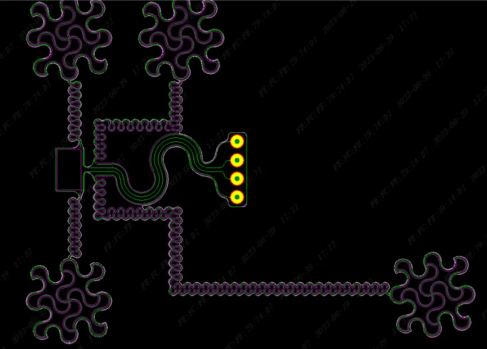 型 號(hào):RM01C00187A層 數(shù):1板 厚:0.12mm材 料:?jiǎn)蚊嬗心z電解銅 厚:1/2 OZ表面處理:沉金2微英寸最小線寬/線距:0.1mm/0.08mm特 點(diǎn):外形復(fù)雜