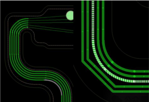 弧形角布線是對具有彎曲角而不是正交(45°)角的走線進行布線的能力。柔性電路板設計要求使用彎曲的走線對總線線路進行布線以減少應力,因此我們必須使用弧線進行布線。