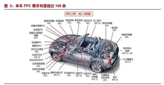 隨著汽車電動化、智能化發(fā)展,F(xiàn)PC 在彎折性、減重、自動化程度高等優(yōu)勢進一步體 現(xiàn),F(xiàn)PC 在車載領(lǐng)域的用量不斷提升,應(yīng)用涵蓋車燈、顯示模組、BMS/VCU/MCU 三大 動力控制系統(tǒng)、傳感器、高級輔助系統(tǒng)等相關(guān)場景。戰(zhàn)新 PCB 產(chǎn)業(yè)研究所預(yù)計單車 FPC 用量將超過 100 片。尤其新能源汽車的大發(fā)展帶動車載動力電池用 FPC 需求大幅增長。